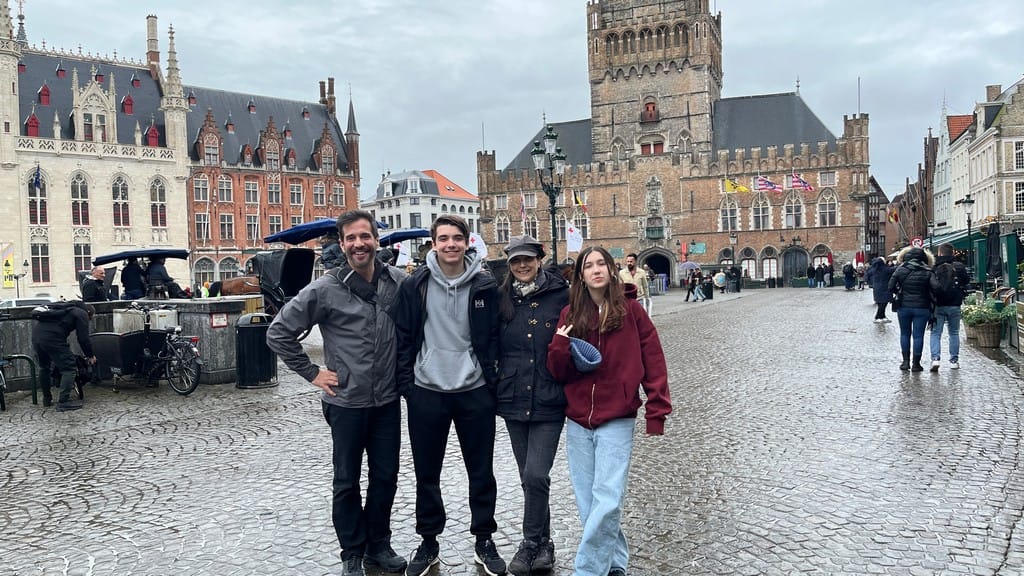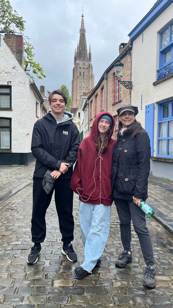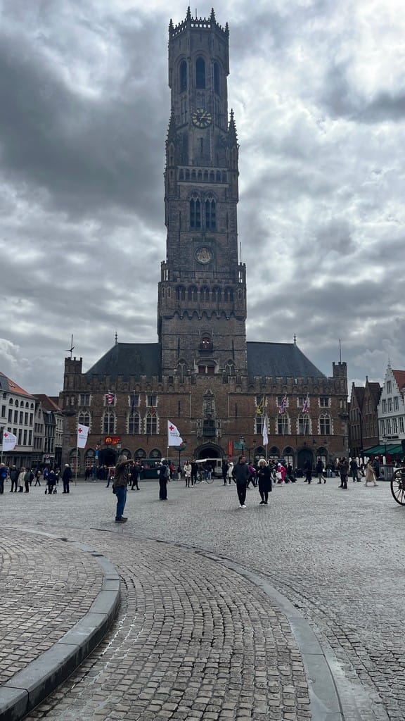 Nobody slept very well. Landed in Brussels, grabbed a couple of croissants and a coffee, and then a train to Bruges. Weather is rainy and a little chilly, but Bruges is beautiful. Ate at a restaurant on the main Square, total mistake, expensive food that was terrible, but the view was good.