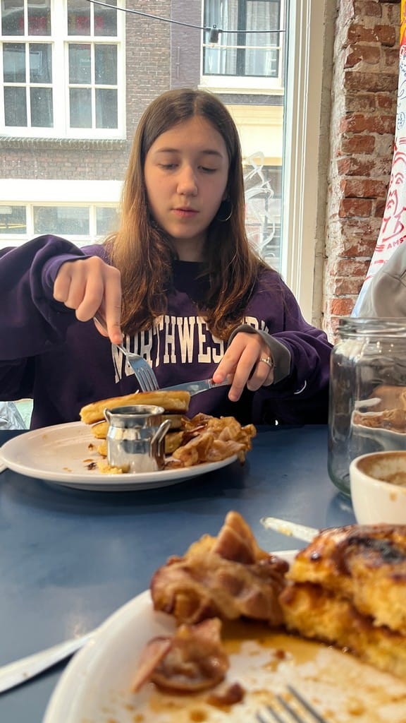 Rolled out a bit late and checked out of the Hoghland House. Made a quick pit stop at Primark to get a layer for Finn and Enzo. Packed around the town looking for breakfast and ended up at Pancake House for banana pancakes. Lots of intermittent rain and even small bursts of hail. The town is busy for 420.