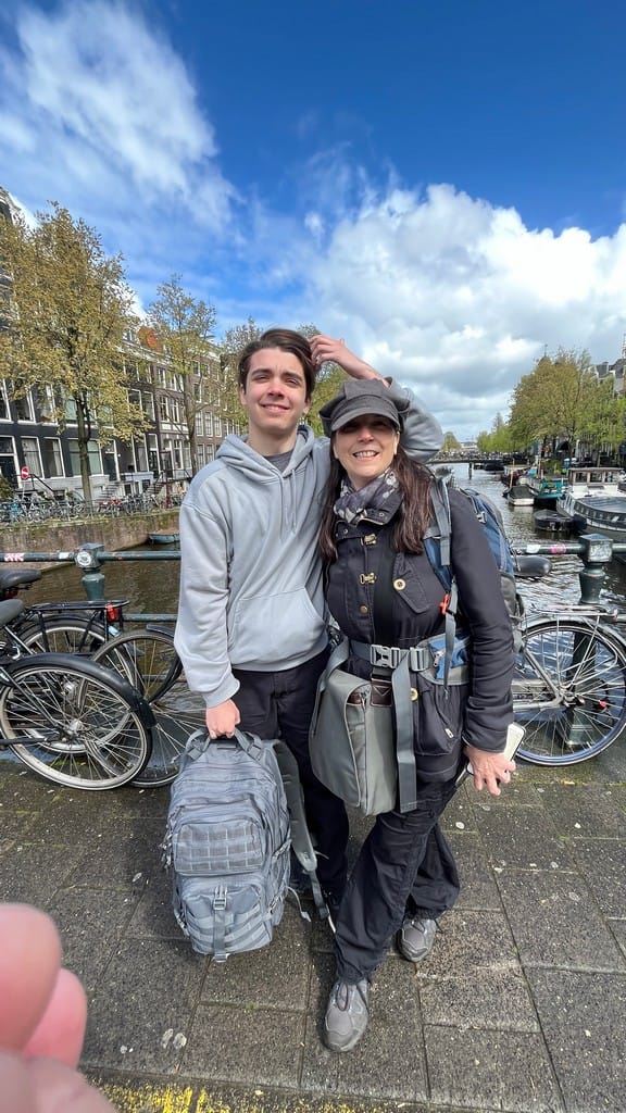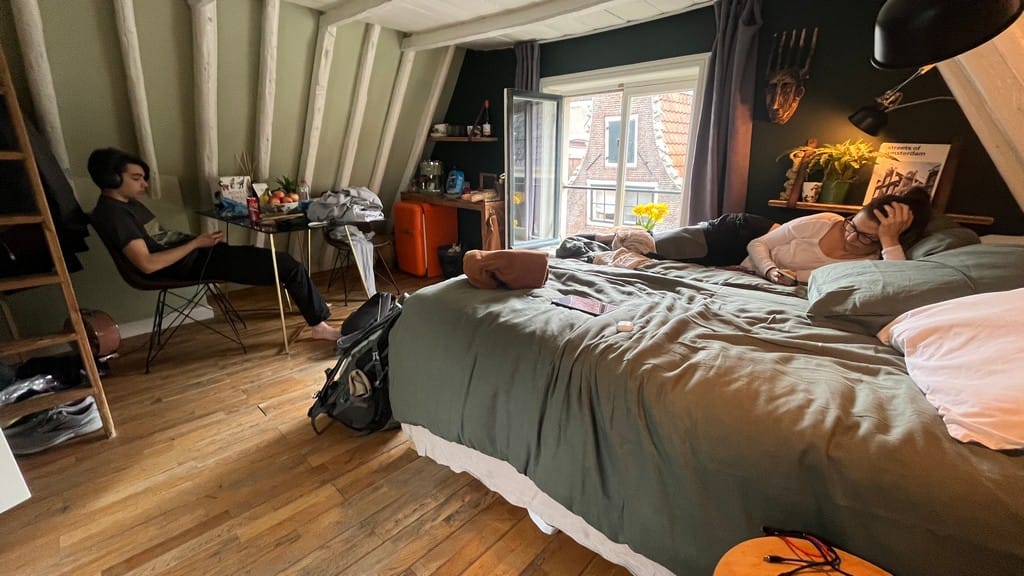 Arrived in Amsterdam, it is packed. We somehow did not realize it was going to be 420 when we were here. Our hotel, the Highland house, is amazing. We are staying in the wine cellar a basement room with two big huge comfy beds and a great shower right in the middle of everything.