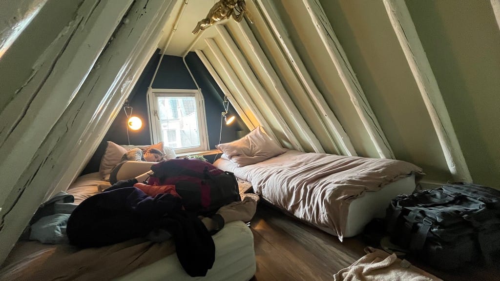 The attic monkey house is a top floor, extremely cozy and snug place. Maybe 200 ft.² total but it has everything we need, it’s centrally located, and surprisingly nice given how cramped the quarters are. The stairs are appropriately treacherous.