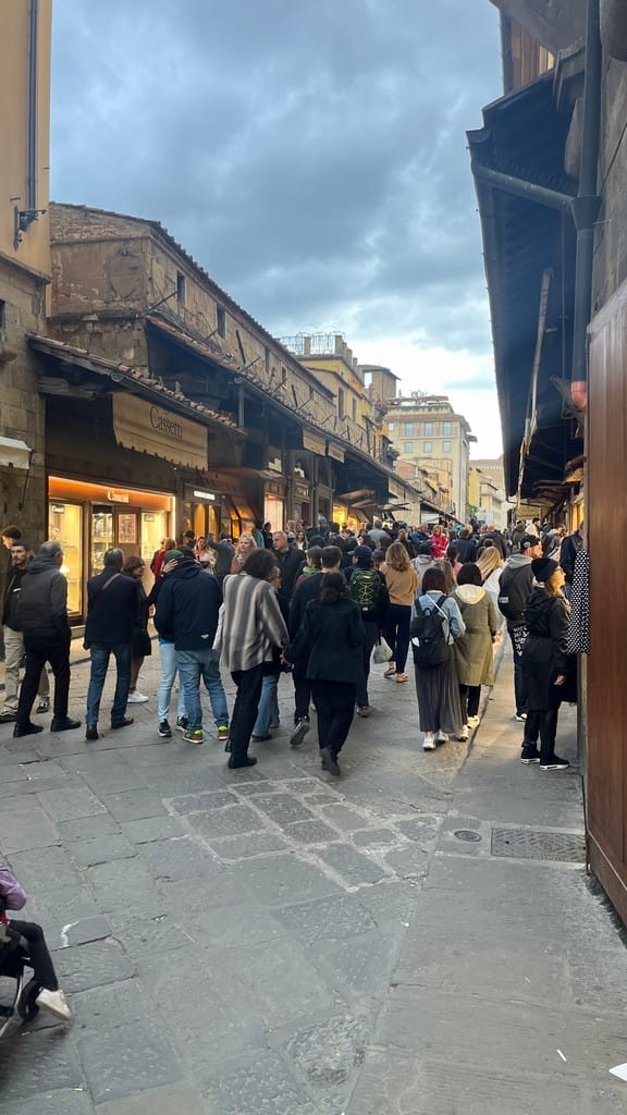 After some more exploring of the town we head back to our our Airbnb. Karen and I venture back out and visit the Basilica Croce where Michelangelo and Galileo are buried. There’s a big French market place setup in the square outside the church. We hike over the Arno and down a ways to another bridge and back.