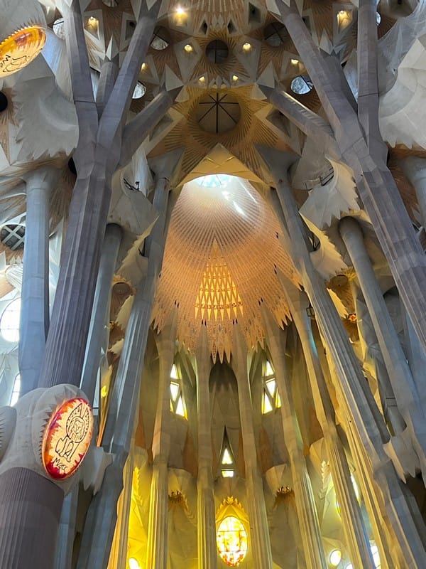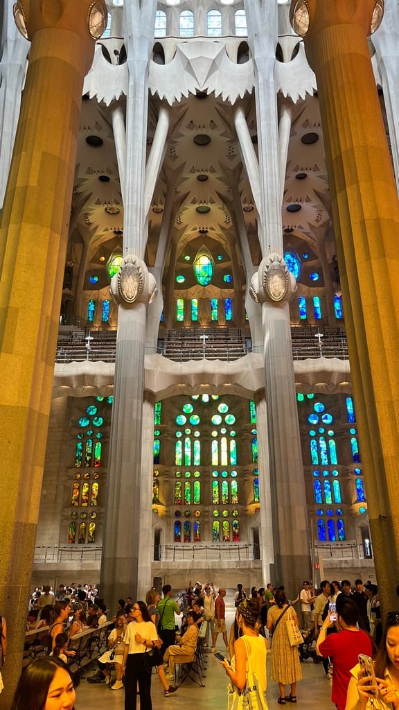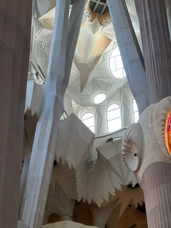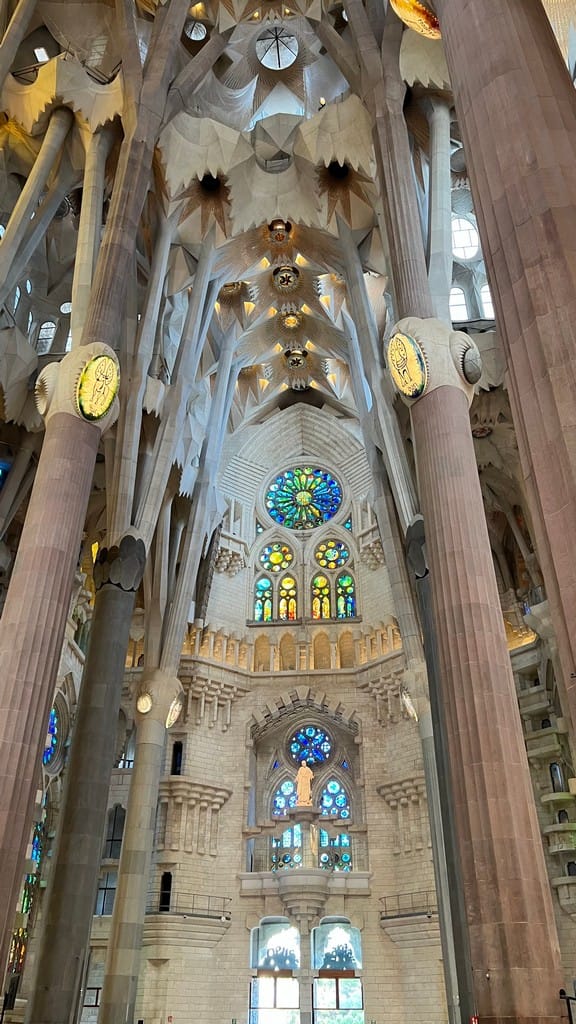 Back to the hotel for a quick cleanup and then out into the city. We did a reconnaissance walk down the beachfront passed all the “chinguitas” aka beach bars. Lots of places to lay out or swim in the Mediterranean, rent a chair under an umbrella. We head up to La Sagrado Familia, and wait in the heat for our tour to start. Outside the sagrada is a mishmash of Sandcastle and Gothic cathedral. Wildly ornate, and busy.