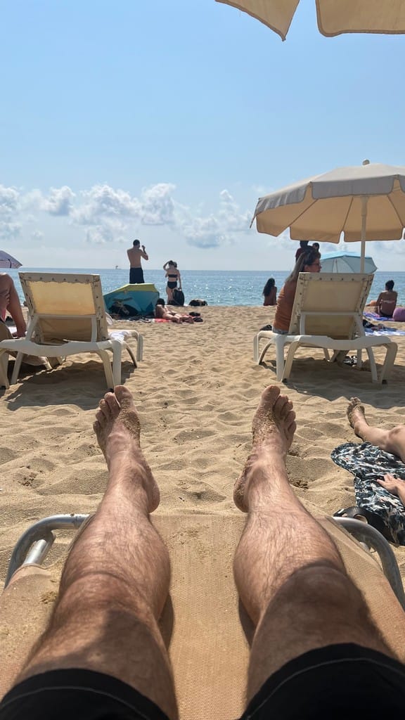 We roll out of bed at a decent hour and pack up for the beach. We grab croissants and donuts at a small bakery on Orwell Square. We you take the subway down to Lacuna to the beach at a chinguita called Vai Monana - it’s a couple km down from Barceloneta and a little quieter. Still busy with touts and tourists. It is wonderfully hot, and we make several dips in the Mediterranean, then come and dry out by laying in the sun. We rent beach chairs and an umbrella which is unnecessarily expensive, but also worth it.