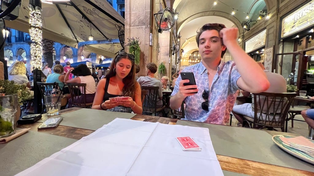 We make our way back from Guell to town and forgo a hotel stop in favor of enjoying the old town by night. Dinner is a fail at a local tourist spot near the hotel - slow, mediocre service and food. But we walk down to Plaza Royal and find a bar on the square where we teach the kids to play spades and have a drink - keeping the fun going until midnight when we head back and crash out at home.