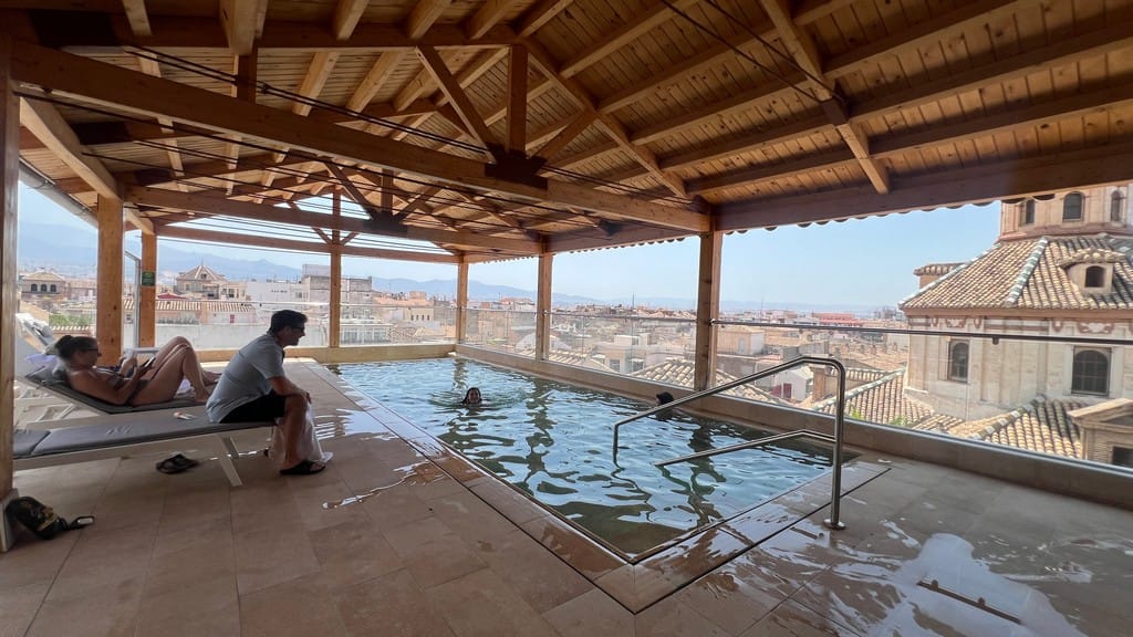 We thought the “long” leg to Cordoba would be the long part of the day but the travel gods had others plans. Our train arrives in Cordoba for a 20 min layover that turns into a 5 hour series of delays and false starts. We nearly rent a car, or book a bus, or buy new tickets on a new train, but all of the solutions have their own problems and finally after losing most of our day, a new train comes into service and we mad Rush into seats and finally get to Granada around 8:30 PM. In time to see sunset on the roof and take a quick dip in the pool.